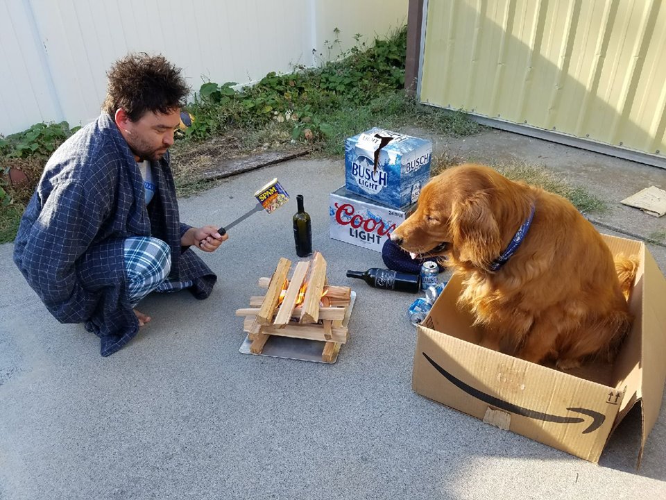 Then on day 14, lightning strikes and Hubs experiences his 15 minutes of internet fame. He spent the day training our dog to sit in a box, and that is what clinched it in my opinion. Our dog sitting in box while Hubs roasts Spam over a fire in our driveway made it to the front page of Reddit and had over a million views. From there, he is picked up by @thefatjewish on Instagram and is the front page image for a meme album on The Chive. Friends start texting that he showed up in this or that feed. People he hasn’t talked to in years see his photo and reach out to say hi. Someone creates an illustration of his photo. I can’t make this shit up. He won the internet…for 15 minutes.